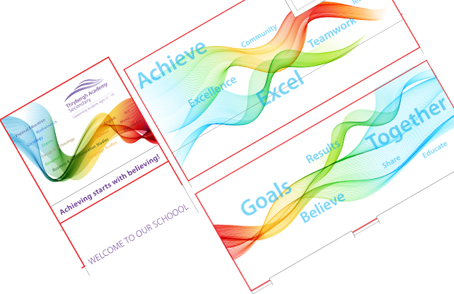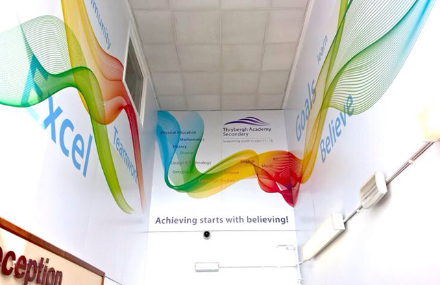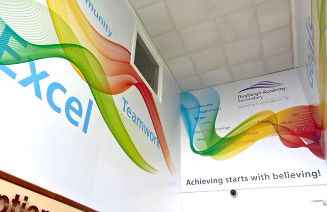 As part of the Thrybergh Academy and Foljambe Campus rebrand, Aspire Creative were commissioned to create a impactful and engaging wall graphic solution for the School’s main foyer.